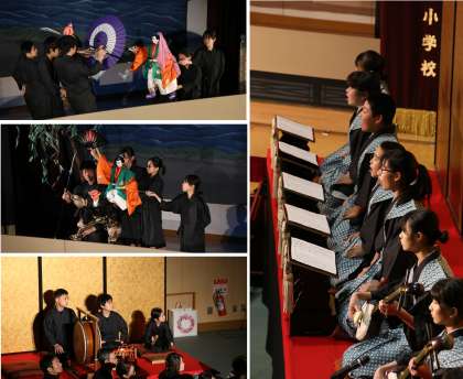 中央区主催の「文楽のいろは」が高津小学校で開催されました。講談やワークショップ、そしてプロの技芸員による人形浄瑠璃文楽「日高川乳相花王」が上演されました。第1部では6年生が出演し、子ども文楽「二人三番叟」「鬼一法眼三略之巻〜五条橋の段〜」を披露しました。