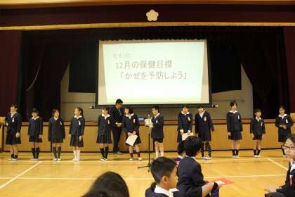 保健給食委員会によるクイズが行われました。クイズはほけんだよりに書かれたことを基にしており、日々の健康について班で楽しく考えることができました。最後には今月の保健目標「かぜを予防しよう」を確かめました。