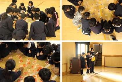 朝の児童集会はお正月集会でした。たてわり班で「カルタ取り」が行われ、みんなで協力して楽しみました。