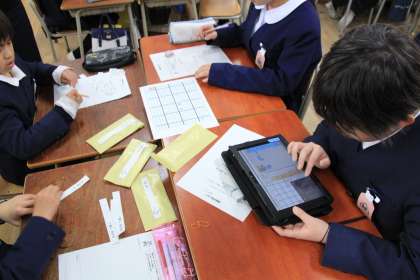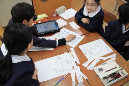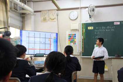5年生は総合的な学習の時間の「道案内をしよう」という単元で、タブレットを使ってプログラミングにチャレンジしました。グループで相談しながら目的地までの道のりを考えることができました。