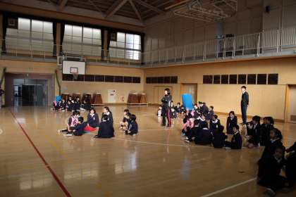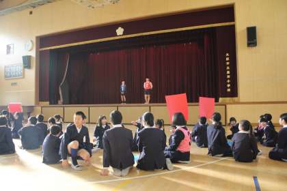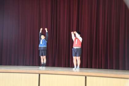 今週の児童集会は運動栽培委員によるラジオ体操クイズでした。正しいラジオ体操はどちらかを班で相談して答えるという活動でした。児童たちは普段なにげなく行っているラジオ体操の動きを改めて振り返り、楽しそうに取り組んでいました。