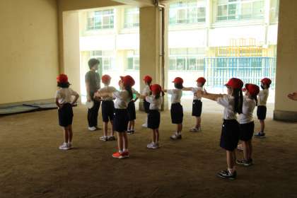 並ぶ順番、列の整え方を練習しました。前のお友達の頭を見てまっすぐ並ぶのはちょっぴり難しかったです。