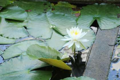 校舎裏の水連や水草の花がほんのちょっぴり涼やかさを運んで