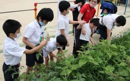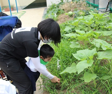 なかよしの学習園に植えたサツマイモの苗が野草で隠れてしまいました。