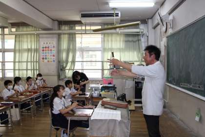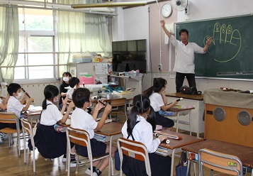 特別に赤松先生にリコーダーの持ち方、穴の押さえ方、正しいタンギングの