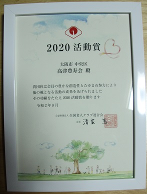 9月1日に、全国老人クラブ連合会より世代間交流の【活動賞】が高津豊寿会に贈られました。平成の初めから、高津小学校の児童に「ふれあい学習」を通して様々な事をわかりやすく教えていただいたり、毎年、手縫いのお雑巾を寄贈してくださったり、そして日々高津小学校の子どもたちを見守ってくださったことが認められ、今回の受賞に至ったそうです。