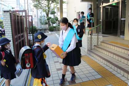 朝から、カバンの中の連絡袋から出したり、家から握りしめてきたりした募金袋を、運営委員の持つ募金箱に入れる姿が見られました。