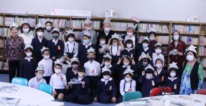 新聞紙で折ったかぶとは、ちょっぴり小さくて、頭の上にちょこん乗せるだけになっていた人もいましたが、とっても素敵な記念写真が撮れました