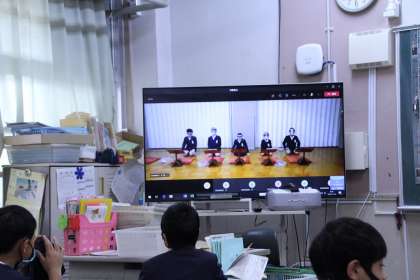 6年生の太夫の児童が説明を聞きながら、音読を始めると、各教室から二人三番叟が聞こえてきました。姿勢を整えお腹から声を出すと、なぜか、気持ちが引き締まり、すがすがしい気持ちになりました。