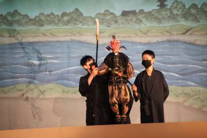 弁慶と牛若丸の出会いの場面です。それぞれの練習が難しく、学習発表会に間に合わないのではないかとさえ思いました。