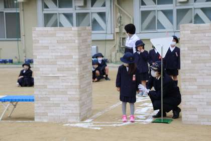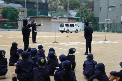 交通安全指導協会の方々に来ていただき、本物の道路さながらのセットで、道路の正しい歩き方を学びました