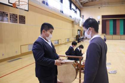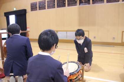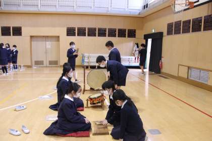 人形では、鳴り物と人形に分かれて教えてもらいました。鳴り物に挑戦したものの、なかなか大きな音が出なかったり、同じリズムを刻み続けることができなかったりと苦戦していました。6年生に持ち方をアドバイスしてもらったり、そばで一緒にリズムを刻んでもらったりして、少しできるようになりました。