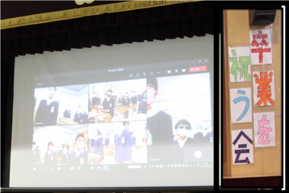 今年の卒業を祝う会は、感染症拡大予防のため、Teamsで講堂と各教室を結んで行いました。