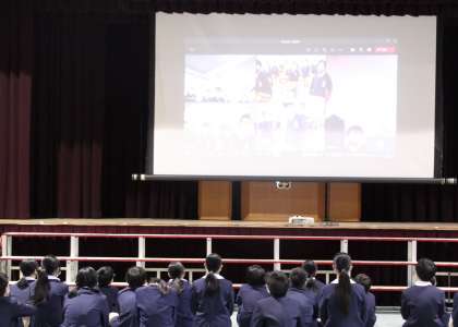 1年生〜5年生まで、気持ちを一つにした群読「雨ニモマケズ」〜高津バージョン〜が始まると、6年生は講堂のスクリーンに映った在校生の様子を優しいまなざしで見守っていました。