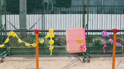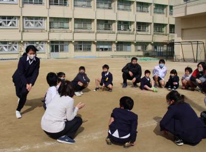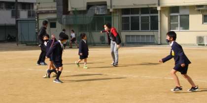 運動場で、卒業生と在校生がしっぽとりや、ハンカチ落としを楽しんだ後、在校生から卒業生に、また、卒業生からも在校生へそれぞれメッセージを伝えました。