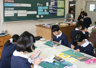 ・自分でつくった消しゴムはんこで模様をつけて小物づくりをしました。