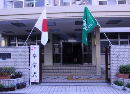 晴天に恵まれ、花道を通って6年生31名が、高津小学校を巣立っていきました。