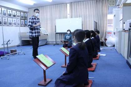 国立文楽劇場でのご公演のさなか、早速技芸員の先生方が指導に駆けつけてくださいました。新型コロナウイルスの感染予防をしたうえで、待ちに待った練習のスタートです。