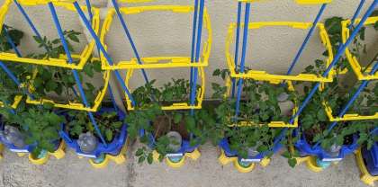 5月12日(水)にミニトマトの苗を植えてから、3週間が経ちました。もう支柱がないと茎を支えきれない大きさになりました。美味しいミニトマトができることを願って、毎日水やりを楽しんでいます。