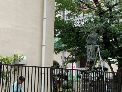 6月11日(金)と14日(月)の二日間、校園営繕園芸事務所・園芸班の方々に、学校の樹木の剪定(せんてい)作業をしていただきました。