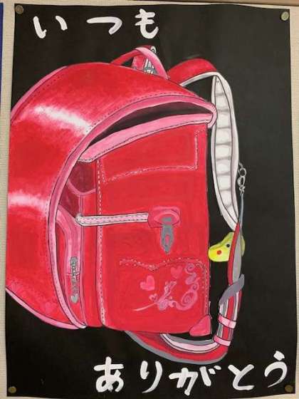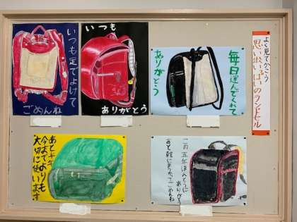 先日、1年生の児童が中央階段の掲示板をじっと見ていました。そこには、6年生の図画工作科の作品、「思い出いっぱいのランドセル」が掲示されていました。小学校生活を5年余り一緒に過ごしてきた自分のランドセルの絵と、ランドセルに対する一言メッセージをかいたものです。1年生の足を止めるほど印象に残る作品に仕上がっています。