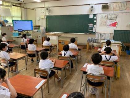 7月20日(火)、1学期の終業式を放送で実施しました。校長先生から、「安心・安全な夏休みを過ごしましょう。」とお話がありました。みんな真剣に耳を傾け、聞くことができていました。