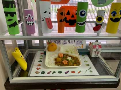 10月14日(木)の給食は、ポークカレーライス(米粉)、キャベツのピクルス、みかん、牛乳でした。