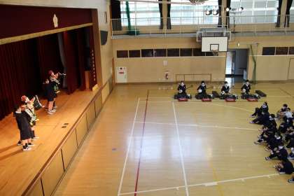 伝達式の最後に、実際に6年生が5年生のために二人三番叟を演じてくれました。