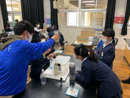 大阪市水道局水道記念館の方にお越しいただき、水を浄化する実験や、水道水とミネラルウォーターの飲み比べなどをさせていただきました。
