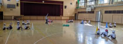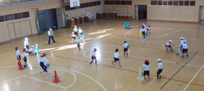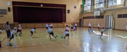 自分の陣地にボールを3つ持って帰ったら勝つ「ボール奪取(ダッシュ)」ゲーム。ルールに気を付けながら、走って奪い、また走り…。大盛り上がりでした。