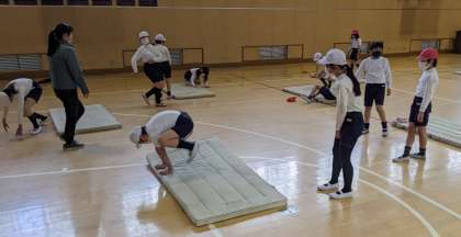 まずはマットの上で支持倒立、ブリッジ、かえる跳び。体がほぐれたところで跳び箱へ。