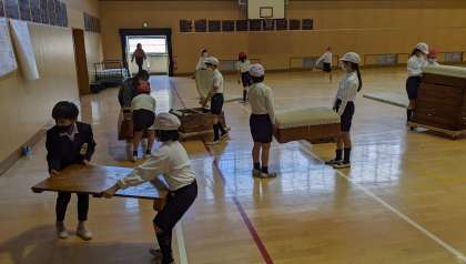 今日は基本の開脚飛びを練習した後で、初めての台上前転に挑戦しました。安全に十分留意してまずは1段から、マットを上に敷いて練習です。慣れてきた人たちは2段へ。後頭部が一番先に跳び箱の上面についているお手本となる人を早速発見しました。