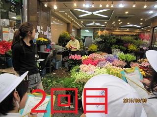 2回目は、平成27年 6月 8日(月)に2年生みんなで国立文楽劇場へ行きました。その後、班ごとに分かれて、黒門市場内にある「花とみ」「石橋食品」「よしや」を回りました。