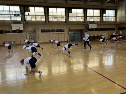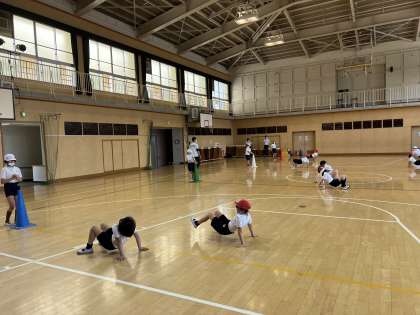 コーンを使った関所じゃんけんゲームでは、関所までスキップをしたり、蜘蛛歩きをしたり普段しない動きをしました。