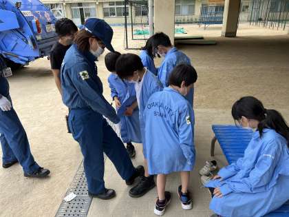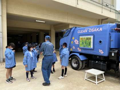 大阪市環境事業局の方に来ていただき、パッカー車がごみを収集する様子を見学しました。子どもたちは、パッカー車がごみを巻き込む様子を見て驚きの声をあげていました。