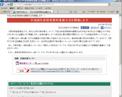 つきましては、区役所や地域図書館など、市内32か所の教科書センターで教科書を展示し、アンケートを受け付けておりますので、是非ともご協力いただきますようお願いします。
