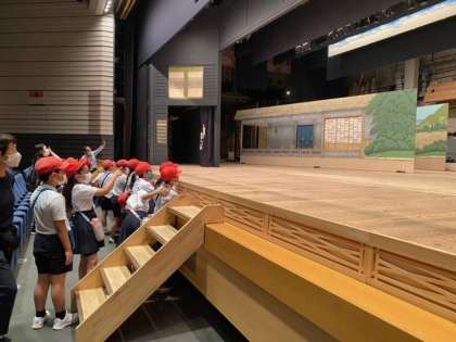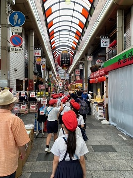 文楽劇場では、実際に劇場内を見学させていただき、展示物や舞台装置についてのお話を聞かせていただきました。その他にも、黒門市場や通学路の様子も確かめました。
