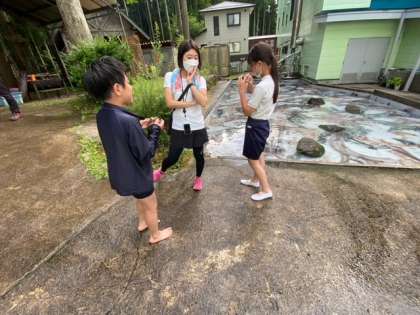 魚つかみをし、ウォータースライダーで遊んだ後、焼き上がったアマゴをいただきました。