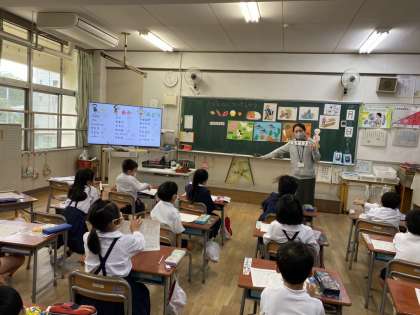 中央小学校の栄養教諭の先生に来ていただき、食べ物や栄養についての学習をしました。
