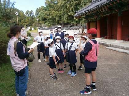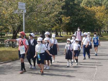 国際庭園では、地図を見ながらポイントを回りました。6年生は最高学年として、チームのメンバーに優しく声を掛け、班をまとめました。5年生は6年生をサポートし、スムーズに活動ができるようにしました。4年生は、来年高学年に仲間入りすることを意識して、5・6年生の活動の様子を確かめました。1〜3年生は、元気いっぱい!笑顔いっぱい!班を盛り上げました!