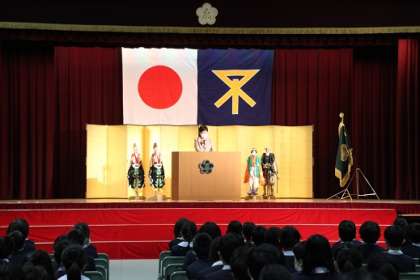 「二人三番叟」の後、「創立150周年記念式典」を開式いたしました。1年生から6年生までの高津小学校の全児童が式典に参加しました。