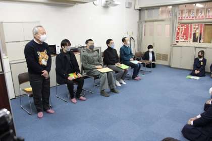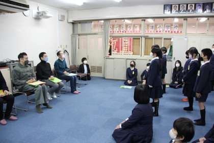 本日、6年生の文楽納め式に引き続き、5年生は、技芸員の先生方との初顔合わせを行いました。これから始まる文楽の学習に対する意気込みを一人ひとりが先生方に伝えました。