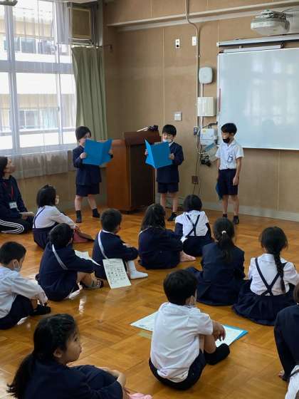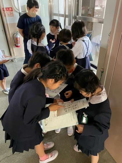 2年生の司会の言葉で学校たんけんが始まりました。1・2年生でそれぞれグループを作り、2年生が案内役になって、1年生とともに音楽室・保健室・校長室など学校内の各教室を見て回りました。1年生は、自分たちの教室以外を訪れる初めての機会で、みんな興味津々でした。2年生から説明してもらい、どこにどんな部屋があるのかを知ることができました。