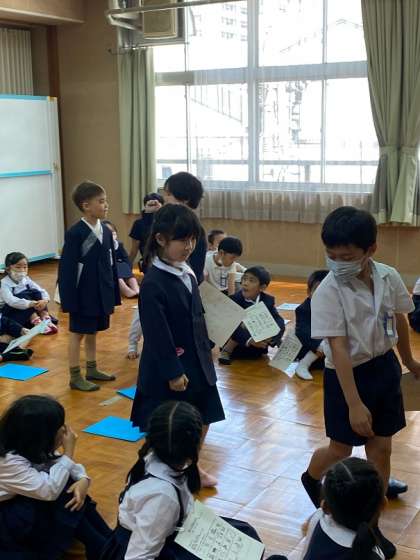 「今からがっこうたんけんをはじめます。」「先生のはなしをききましょう。」