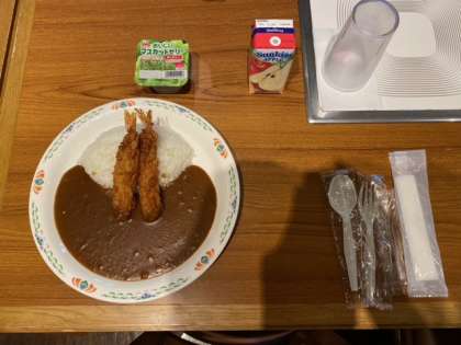 メニューは、エビフライカレー、マスカットゼリー、リンゴジュースです。