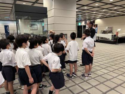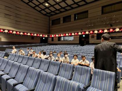 文楽劇場では、ロビーや客席、展示場と館内のたくさんの場所を見せていただくことができました。客席では、舞台の秘密やお仕事をされている方の工夫について教えていただくことができました。子どもたちは次から次へと浮かんでくる質問を劇場員の方に投げかけては答えていただいていました。