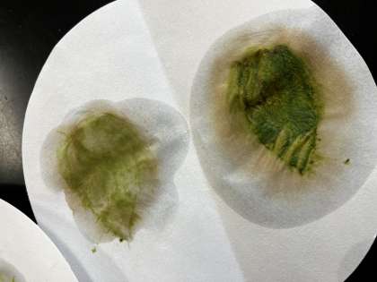 理科の実験で、学校の葉っぱにヨウ素液を垂らしてでんぷんがあるか実験しました。