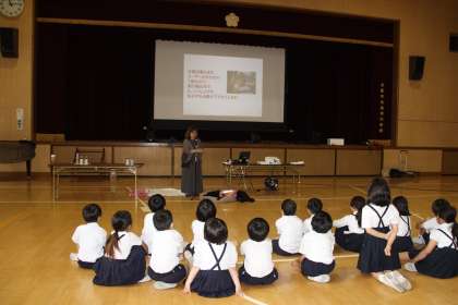 補助犬には、目に障がいがある人のお手伝いをする盲導犬、手や足に障がいがある人のお手伝いをする介助犬、耳に障がいがある人のお手伝いをする聴導犬がいることを手話と歌で学びました。歌に出てくる手話を見よう見まねで一生懸命していました。