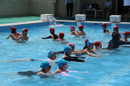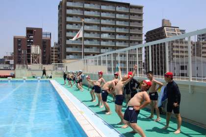 引き続いてプールに入ったのは中学年。まず、しっかりと先生の話を聞いて、プールに入る時のルールを確認します。さすが中学年ともなると、バディの確認もスムーズです。