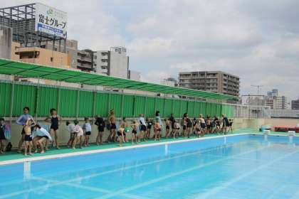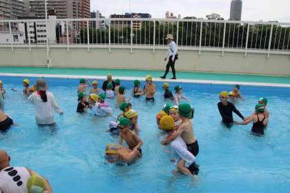 この日をとても楽しみにしていた1年生は、6年生にサポートしてもらいながら、プールでのルールをひとつずつ覚えていきました。